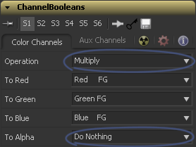 For multiplication, set the Apply Mode = Multiply in Merge, or Operation = Multiply and To Alpha = Do Nothing in the ChannelBoolean tool.